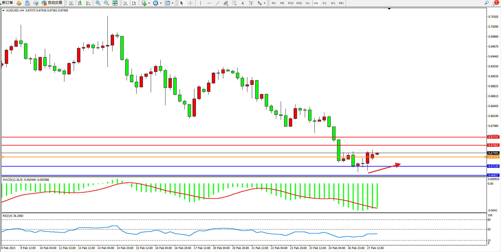 备选策略:0.67319下方看跌,目标0.67120、0.66927