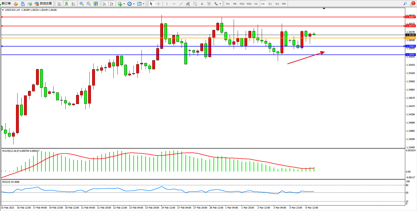 美元加元USDCAD——4小时K线图显示: