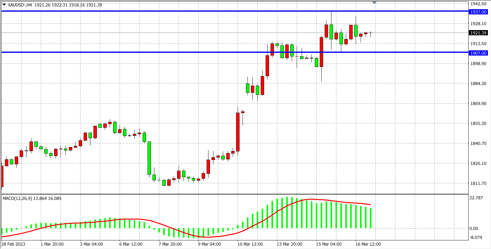 4小时图看,现货黄金在高位进入盘整,MACD在零轴上仍维持较均匀放量,多头趋势依旧占优,日内关注1907-1937箱体区间,箱体内看震荡,上破1937看1950-1970,下破1907看1885-1860。