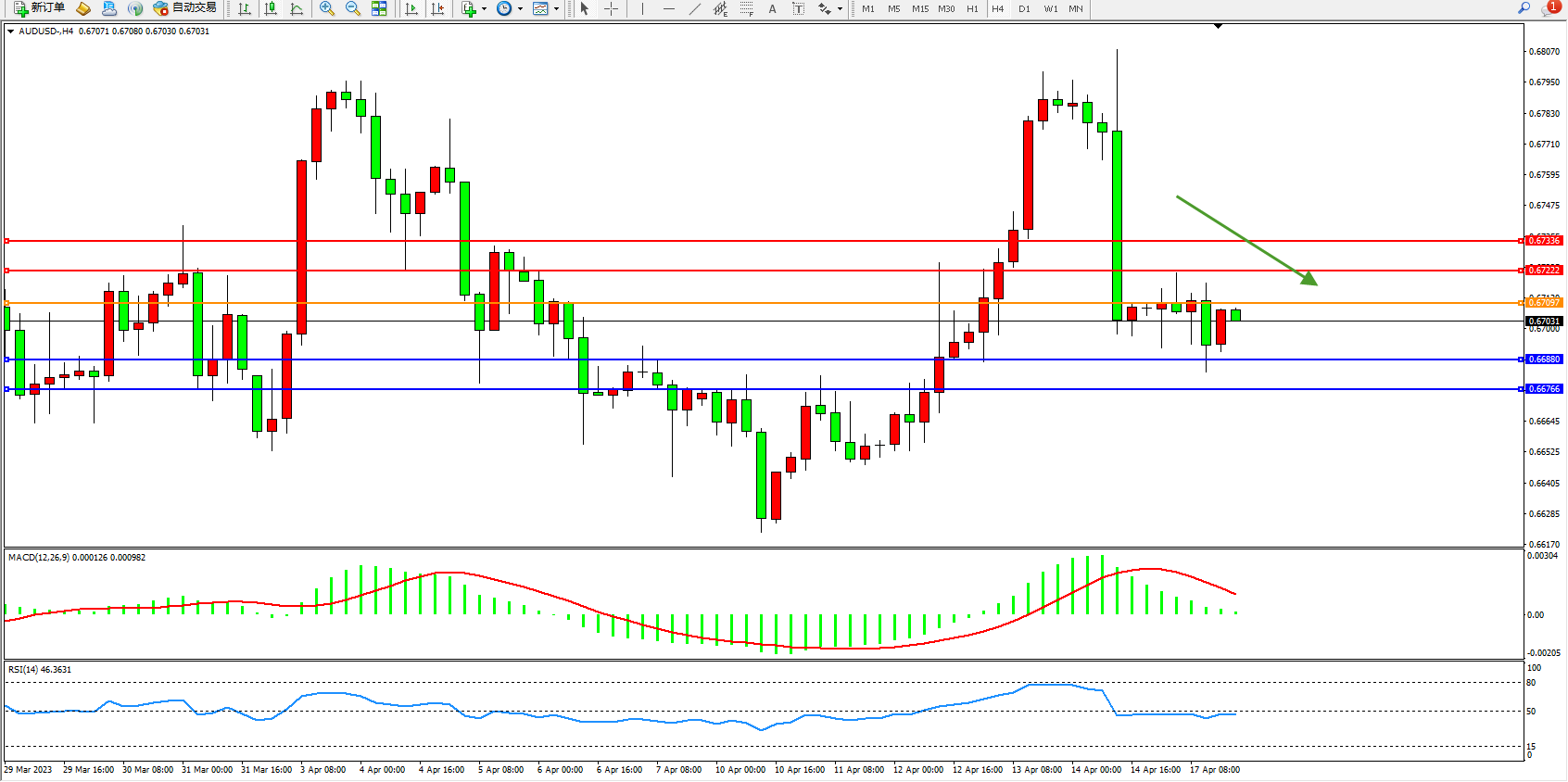 交易策略:0.67097下方看跌,目标0.66880  0.66766