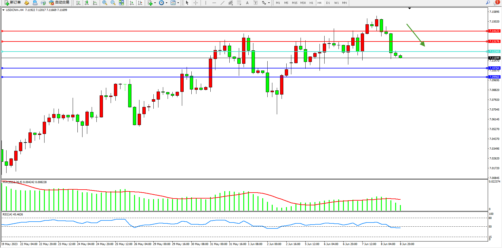 美元人民币USDCNH——4小时K线图显示: