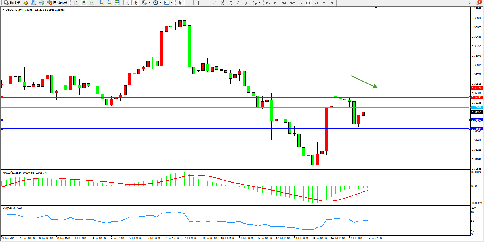 美元加元USDCAD——4小时K线图显示: