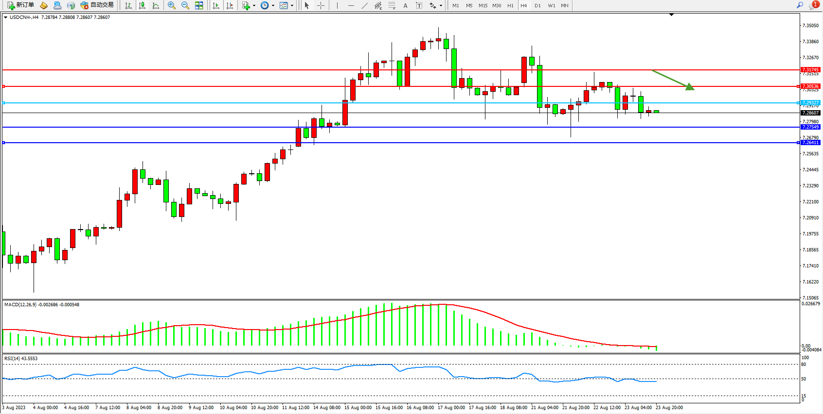 交易策略:7.29327下方看跌,目标7.27549 7.26411