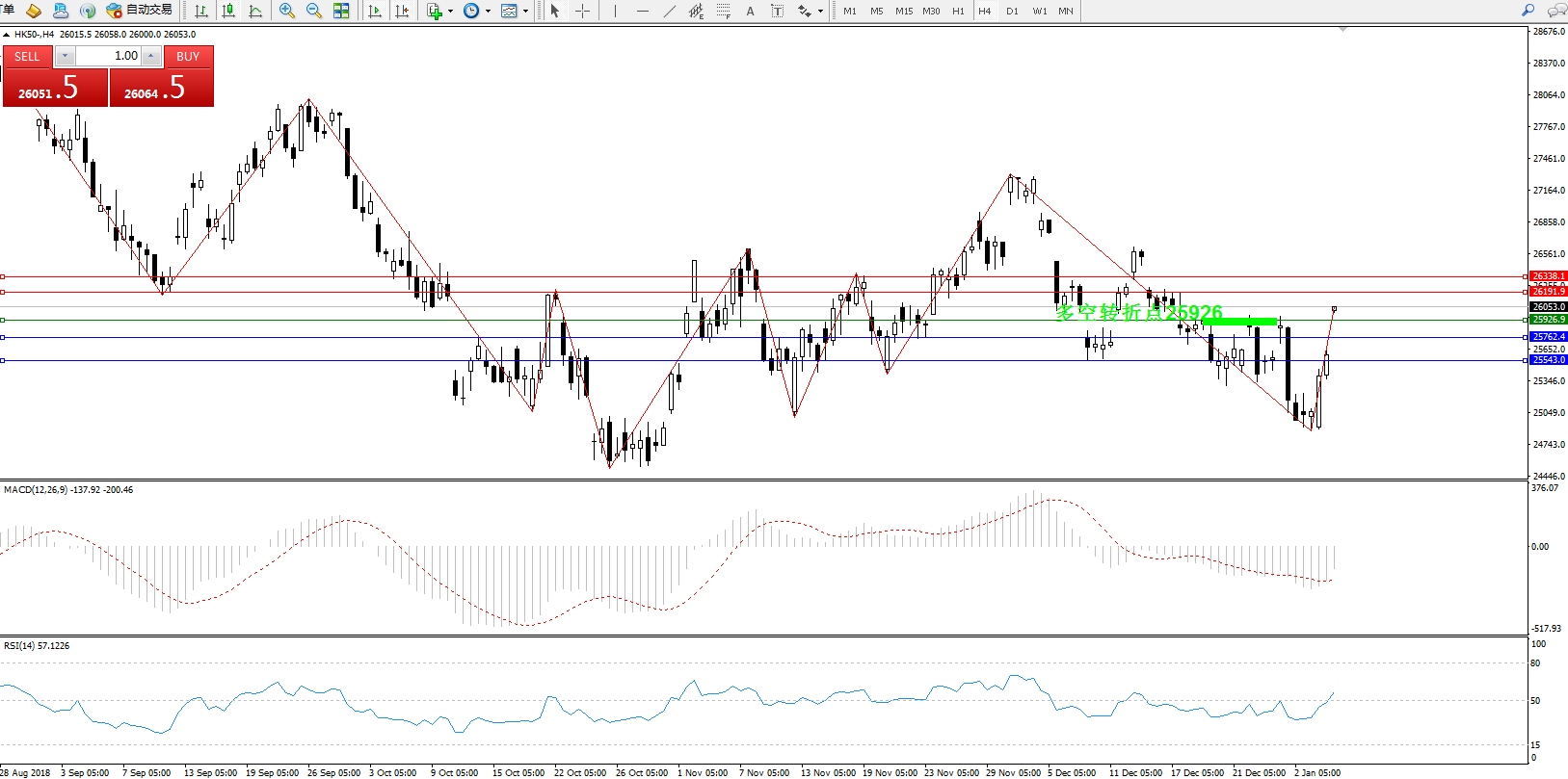 恒指HK50 ——4小时K线图显示: