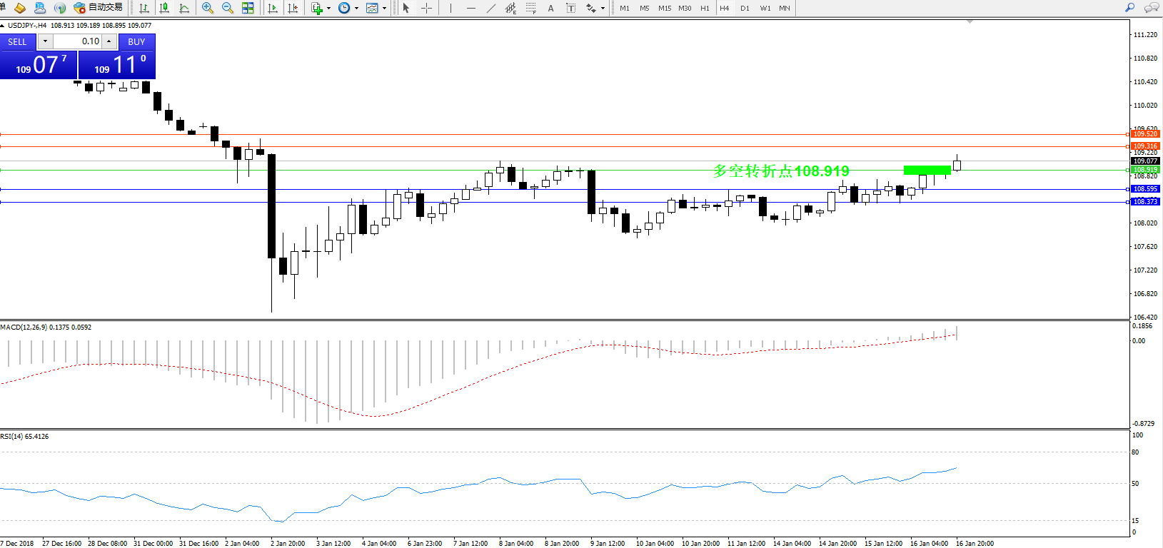 交易策略:108.919上方看涨,目标109.316、109.520