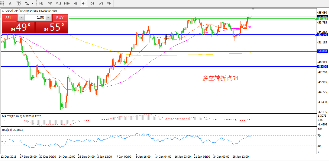 4小时图看,油价在52-54美元整理后, 昨日强势突破,日内重点关注54美元一线得失。均线系统走平, MACD红柱增加,反弹概率较大。