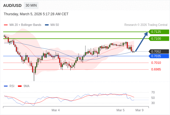 在 0.7035 之上,看涨,目标价位为 0.7100 ,然后为 0.7125 。