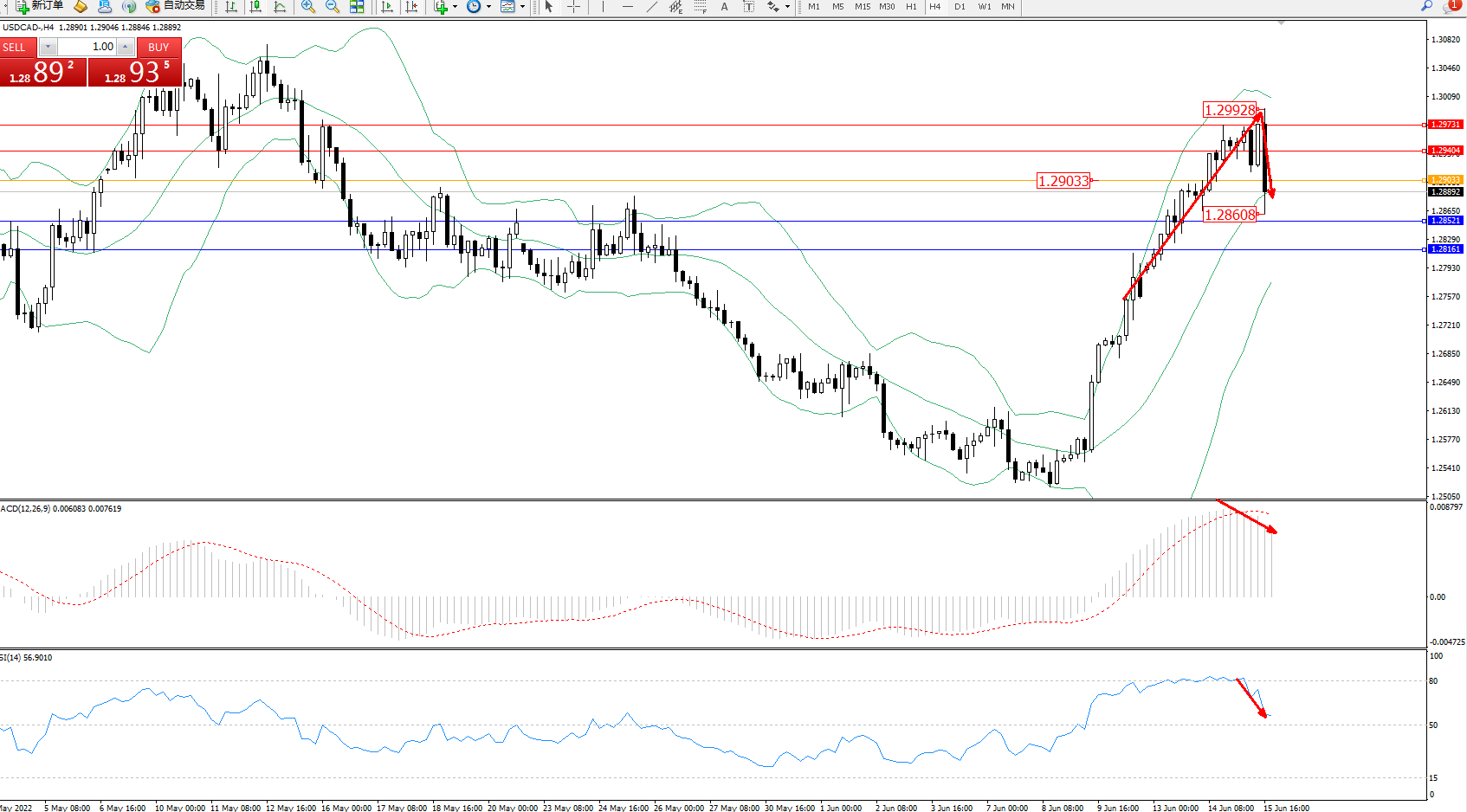 美元加元USDCAD——4小时K线图显示: