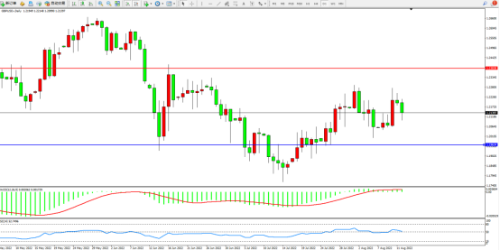 低位多头动力维持震荡上扬后整理,短期或维持宽幅震荡,市场整体上移走势开始有减弱迹象,上方压制关注1.23838附近,低位支撑关注1.19634附近,MACD指标处于0轴线上侧徘徊,RSI指标处于50均衡线上侧整理,如图: