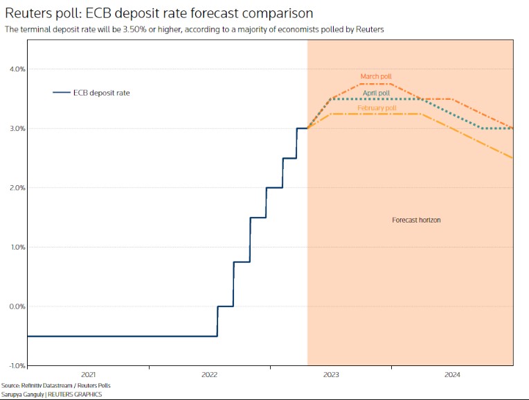 中位数显示,欧洲央行存款利率预计在6月份达到3.50%的峰值,低于3月份预期的第三季度达到3.75%的峰值。尽管如此,截至年底,仍有相当一部分人(68人中有30人)预计利率将达到3.75%或更高。