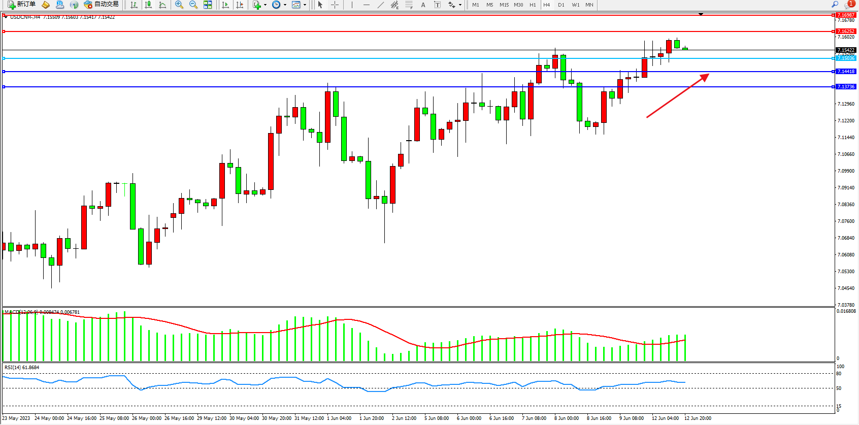 美元人民币USDCNH——4小时K线图显示: