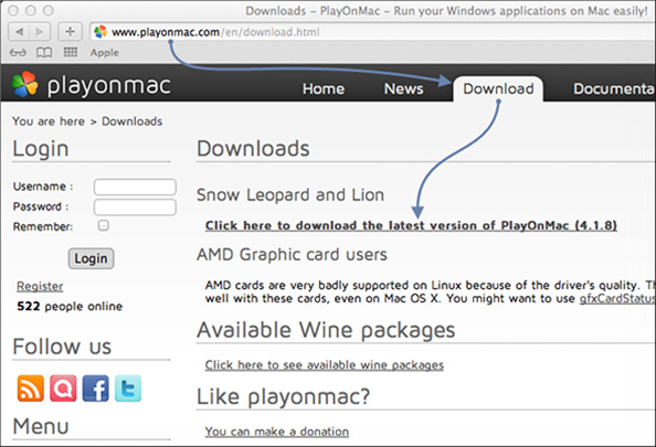 1. 要安装 PlayOnMac,请打开产品的官方网站,前往download(下载),点击 链接下载最新版本。