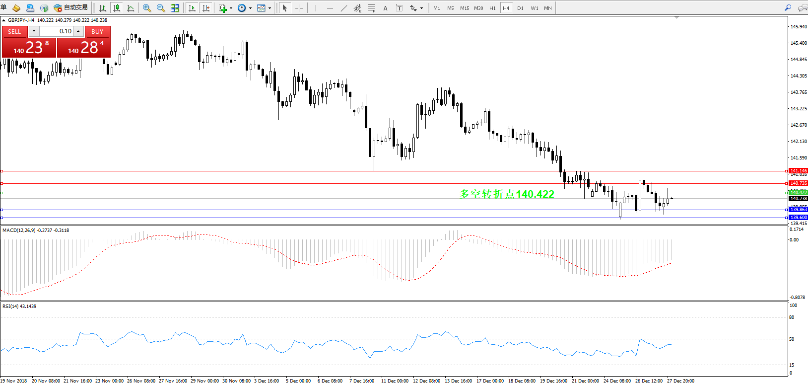 交易策略:140.422下方看跌,目标139.863、139.600