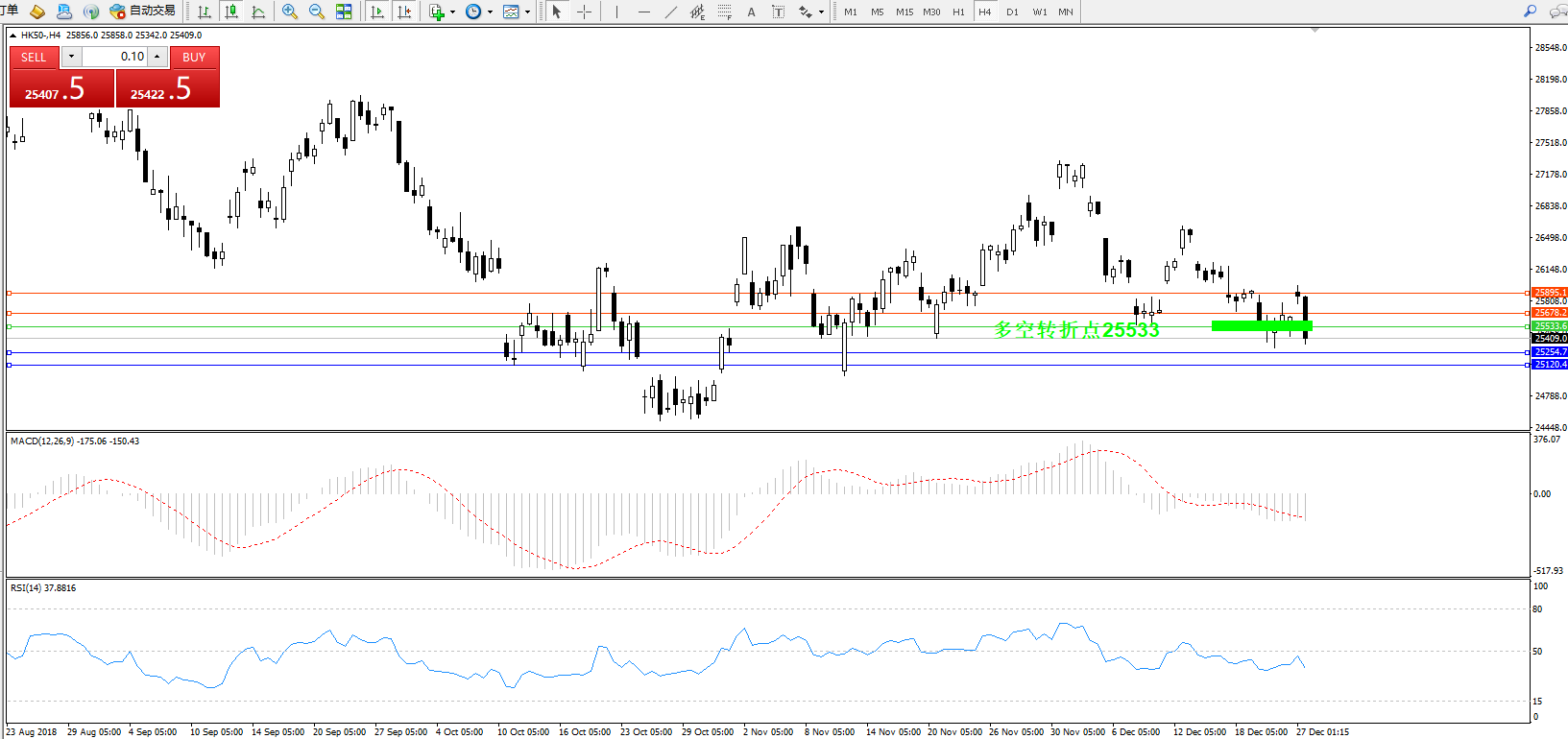 恒指HK50 ——4小时K线图显示: